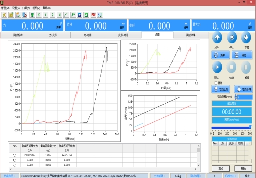 - 采用多线程并行处理技术,测试过程中实时同时显示力量-位移、力量-时间、位移-时间、应力-应变等曲线,可随意切换到想看的曲线画面,并可查看用户设置等。